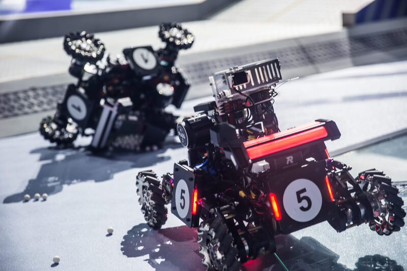 为了模拟实战,比赛场地中设置了“河流”、“草地”、桥梁和隧道,以及各种提升能力的“机关”。机器人需要一边躲避弹丸,一边攻击对方,这对机器人的机器视觉和机器学习能力提出了很高的要求。