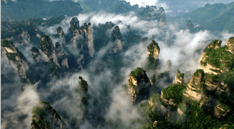 如果你看过电影《阿凡达》,对潘多拉星球上群山漂浮的场景一定记忆犹新。悬浮在空中的巨石穿云列阵,陡峭的岩壁上长满了植物,甚至还有瀑布飞流直下。实际上,要身临其境并非天方夜谭——在雨雪后的晴天来到张家界武陵源,那云雾缭绕的座座石峰正是电影取景的真实画面。