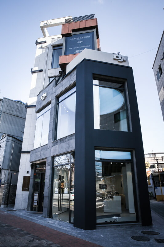 • A/S 센터: 펌웨어 업데이트 및 방문수리를 위한 예약 접수 등 고객의 기술 지원 제공 이번에 오픈한 플래그십 스토어의 외관은 DJI와 홍대 지역의 분위기를 반영하여 디자인했다.