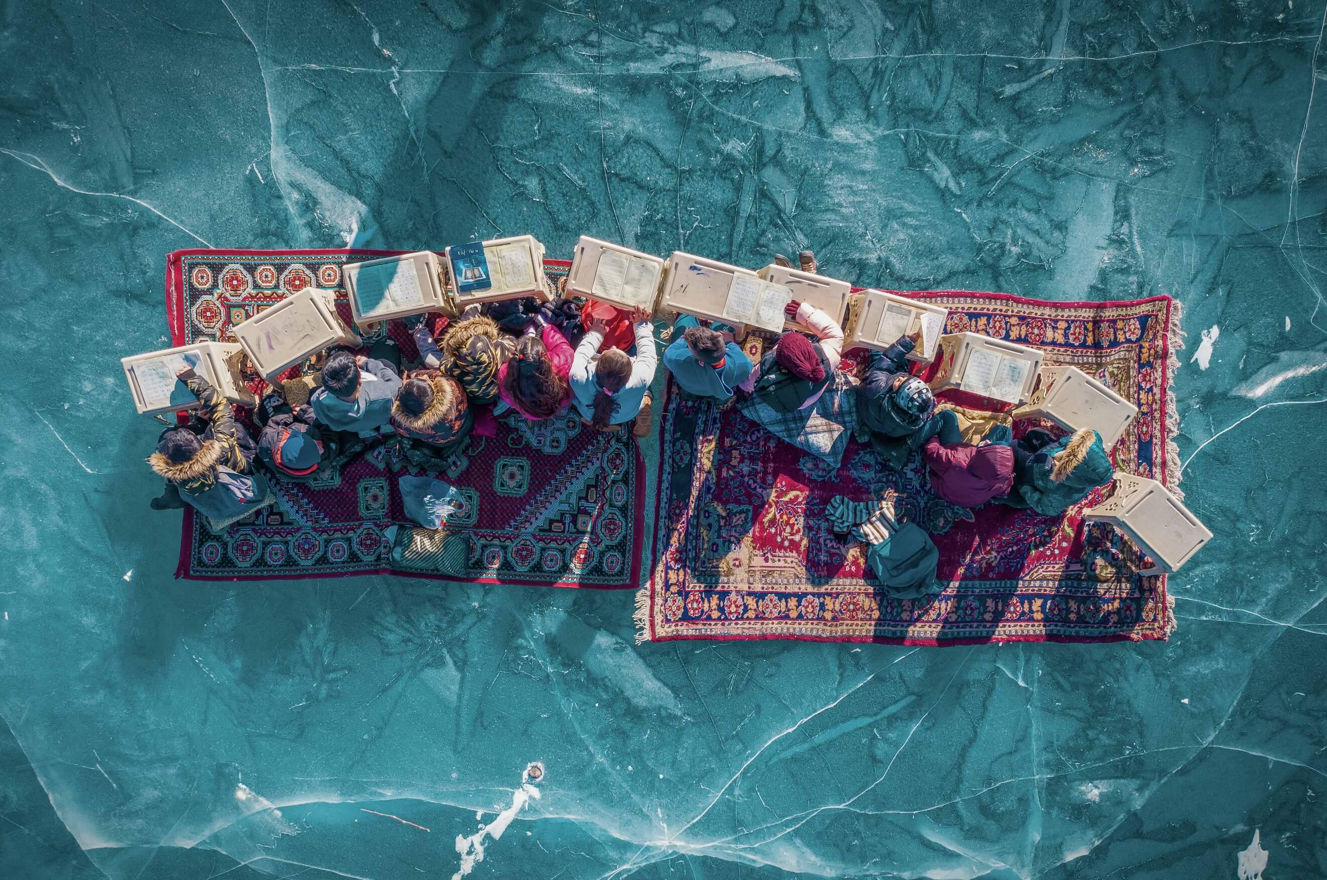 "Education on the Ice of Lake Çıldır" by İsmail Kaplan: Captures children studying on a frozen lake amidst a harsh winter. Judge Jiang Ping, former Chief Photographer of Chinese National Geography, praised the contrast of warm and cold colors. At the same time, Professor Zhu Jiong of the Beijing Film Academy’s School of Visual Media and Communications called the "nature classroom" incredible.